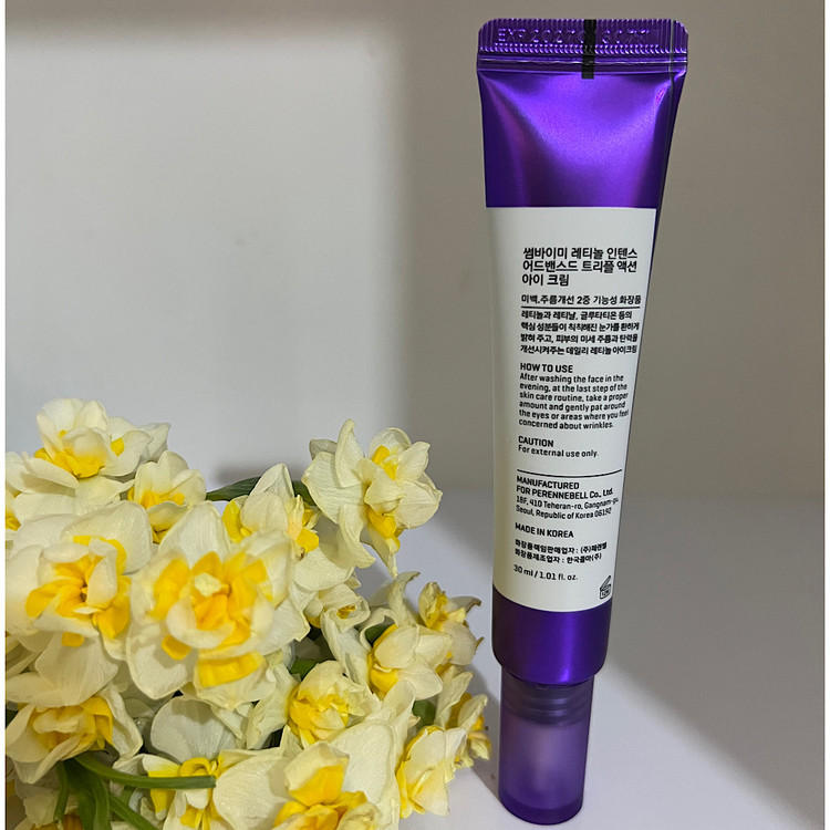 دور چشم سام بای می حاوی 0.1% رتینول است که از مشتقات ویتامین A بوده و یک لایه بردار قوی است. این دور چشم موجب کاهش عمق چین و چروکهای اطراف چشم شده و لکهای پوستی این ناحیه را تا حد زیادی بهبود میبخشد و سطح و رنگ پوست را صاف و یکدست میکند. دور چشم رتینول دار سام بای می خستگی و کدری پوست اطراف چشم را نیز برطرف کرده و از افتادگی پوست جلوگیری میکند؛ همچنین قوام و سفتی پوست را نیز افزایش میدهد و موجب روشنتر و شفافتر شدن پوست این ناحیه میشود